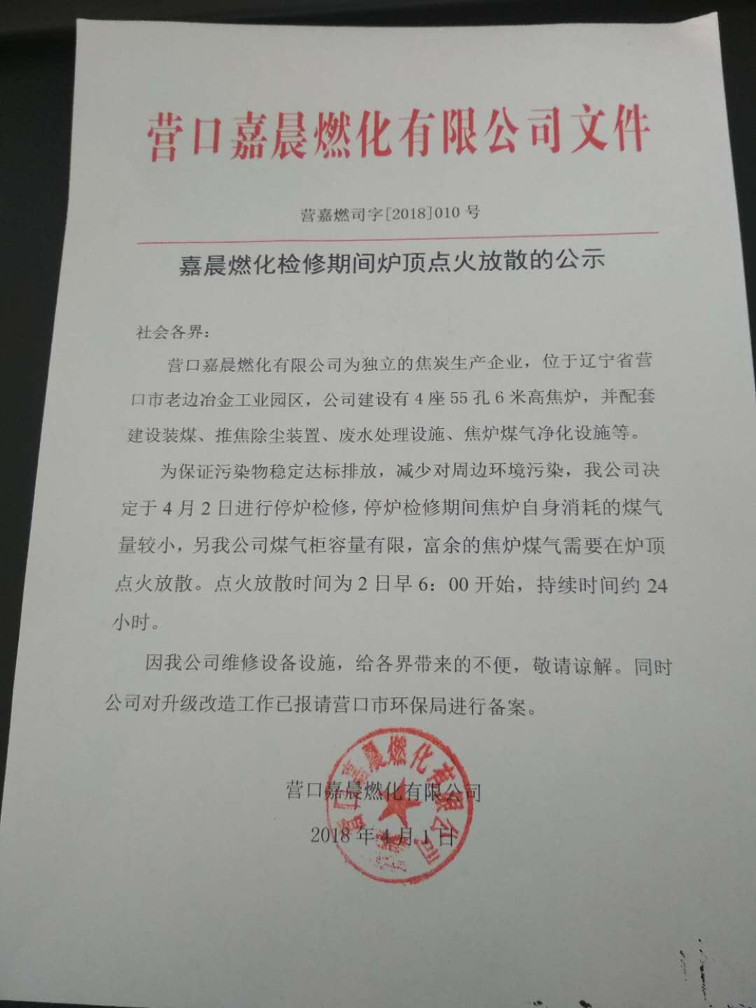 營口嘉晨燃化檢修期間爐頂點火放散的公示